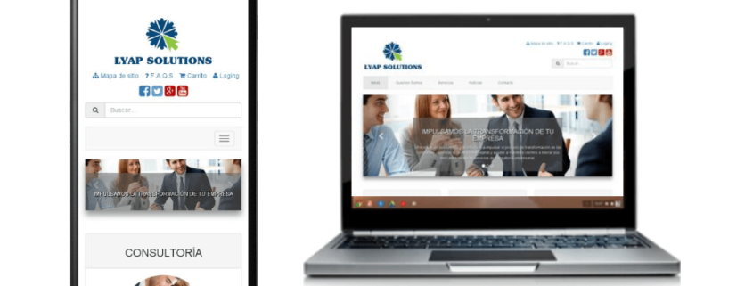 La página Lyap Solutions esta diseñada con HTML5 y presenta un diseño elegante con 03 slides principales, seguido de un menú responsive, 03 secciones de servicios, una sección tipo blog, con un código limpio que hacen la carga más ligera, ya sea desde un móvil o computadora.